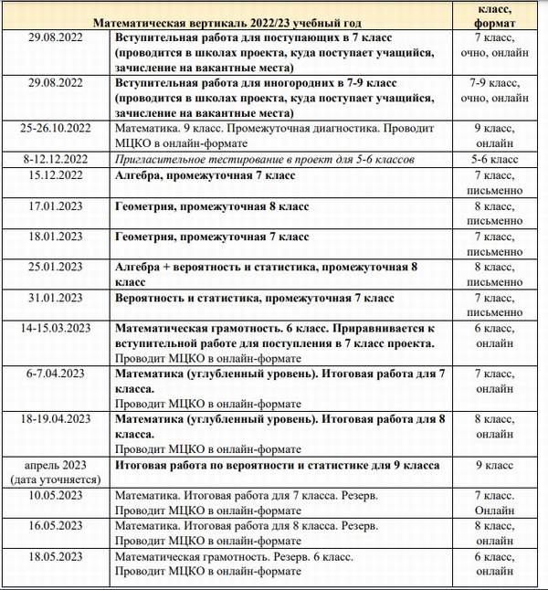 «Математическая вертикаль» - городской образовательный проект для учеников 7-9 классов. Шестиклассники участвуют в пригласительном тестировании в декабре и пишут вступительное тестирование в конце учебного года.