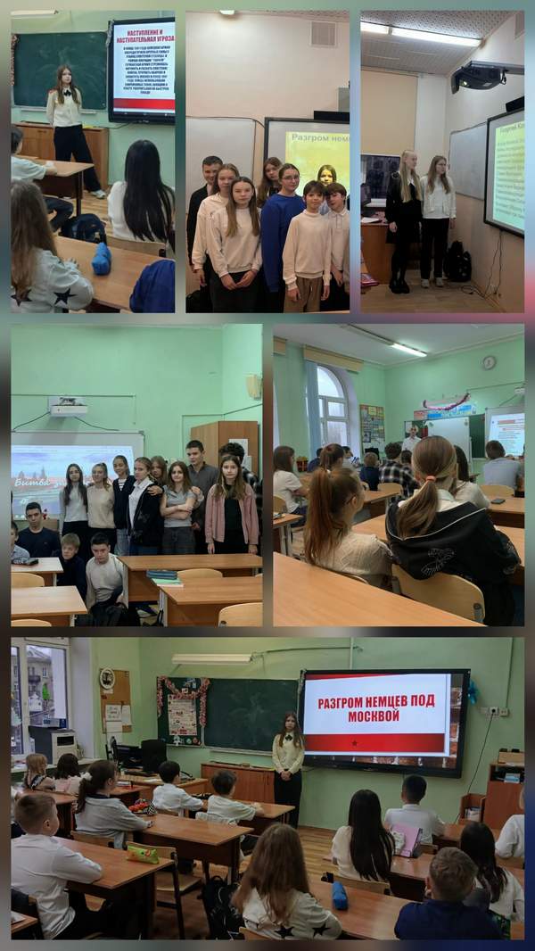 С 1 по 10 декабря 2025 года члены совета музея «Молодая гвардия» провели в 5-7 классах беседы о Московской битве. Боевые действия советских и немецких войск на московском направлении, длившиеся с 30 сентября 1941 года по 20 апреля 1942 года. Стратегическая наступательная операция немецких войск осенью и зимой 1941 года носила наименование «Тайфун». Битва за Москву включала в себя Московскую стратегическую оборонительную операцию 1941 года, Московскую стратегическую наступательную операцию 1941—1942 годов, Ржевско-Вяземскую стратегическую операцию 1942 года и Торопецко-Холмскую фронтовую операцию 1942 года. В Московской битве в разное время участвовали войска Западного, Калининского, Резервного, Брянского, левого крыла Северо-Западного и правого крыла Юго-Западного фронтов.